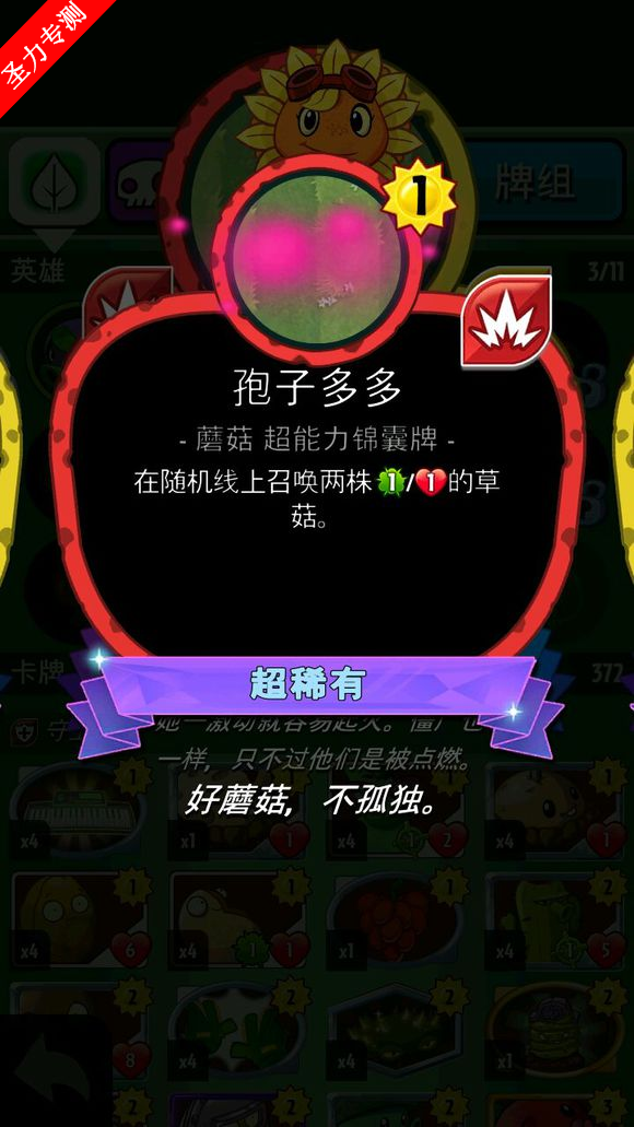 c、孢子多多:在随机线上召唤两株草菇。植物版斗舞,裸下就改名叫盾值多多了。没有健身菇和复仇菇的话,对方的盾值长得呲溜呲溜的。配合蘑菇地带可以快速铺场,然后松果再上场(分子植物滚开点 啊喂),基本上就稳赢了(超新星,9000和灭绝事件+除草剂教你做人)。