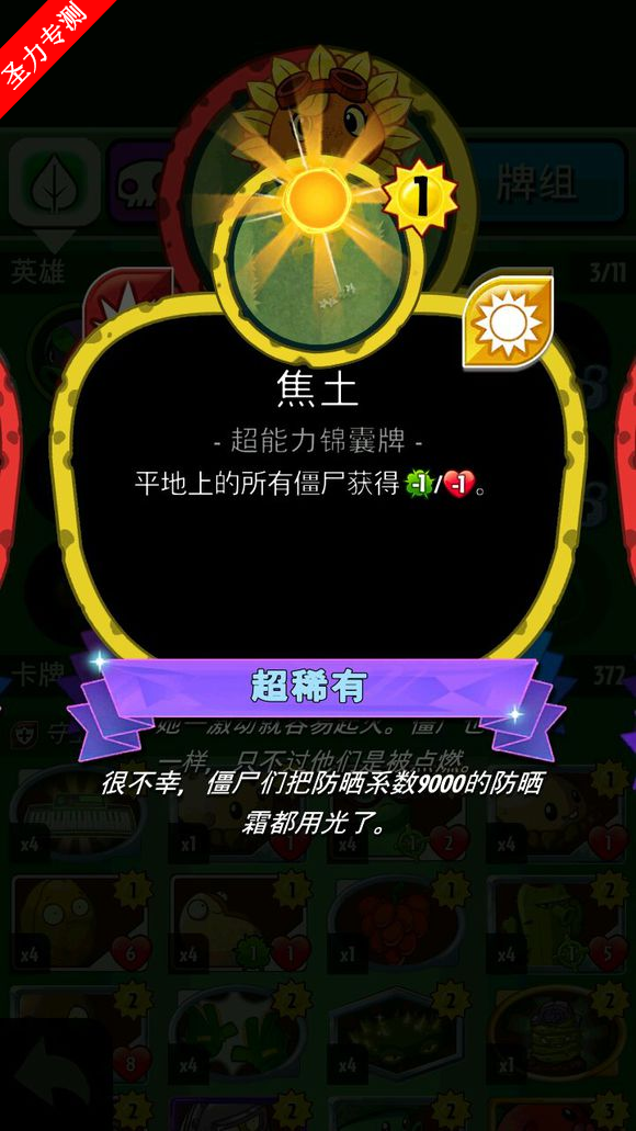 d、焦土:平地上的僵尸获-1/1,植物版酸雨,疯狂克星,打出后疯狂的僵尸基本上非死即残,不是疯狂僵尸的话也有削弱的效果。