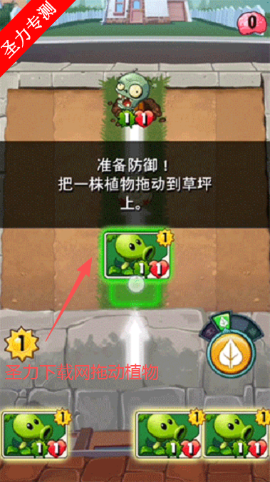 2、进入游戏便可直接开启第一关卡,根据新手指引来拖动下方的植物到草坪。