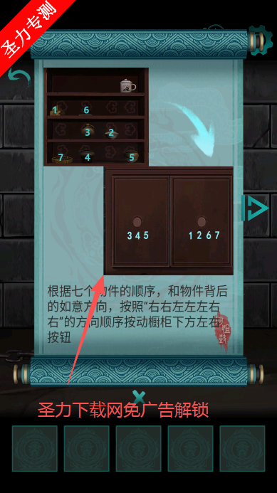 先调查一下左边地上的鼓写着5324,恩这种裂纹数字米雪就不用多说了,很直白,然后看一眼中间位置柜子,下面就是四个鼓的图案,调整一下到5324,打开获得麻绳。