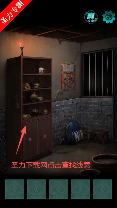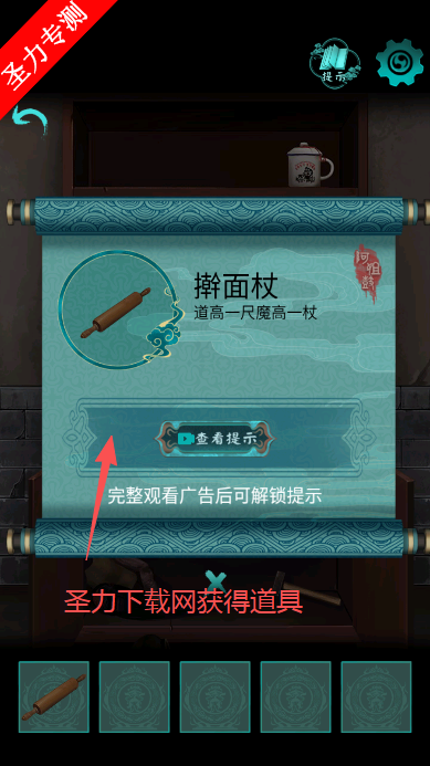 调查一下旁边的灶王爷画像,上面就有柴米油盐酱醋茶,然后按照这个顺序,把后面图案看做是箭头,这样的话对应的就是柴(右)米(右)油(左)盐(左)酱(左)醋(右)茶(右),按这个顺序点击柜子下面的把手打开拿到锤子和擀面杖。