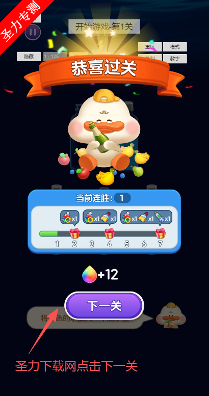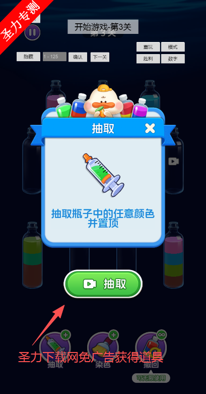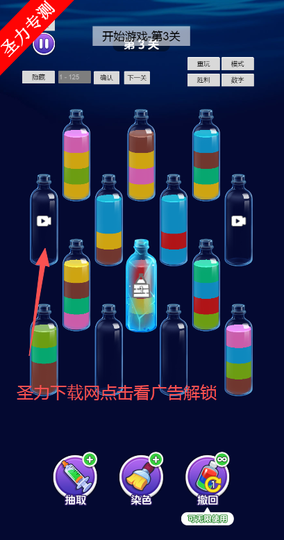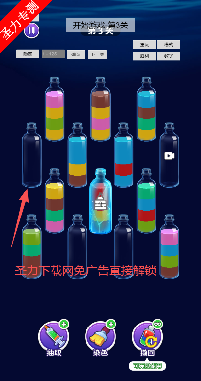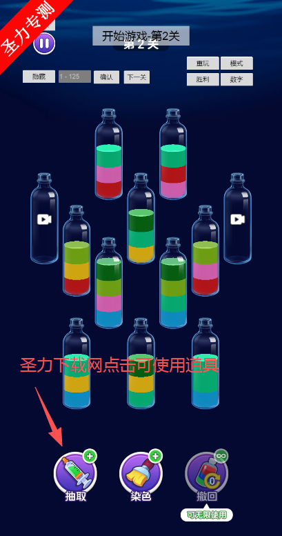 4、完成全部瓶子即可通过关卡,点击下一关。