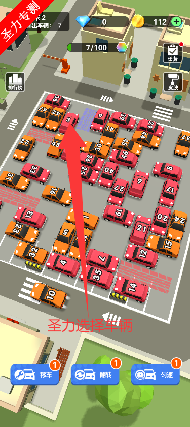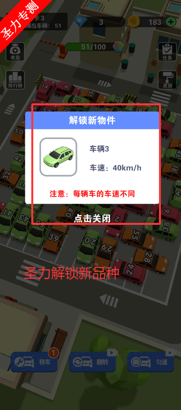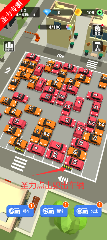基础挪车操作:玩家通过点击并滑动屏幕,控制停车场内的车辆(轿车、卡车等)沿直线移动,每次移动需占据完整空格,不可中途停止或转向;