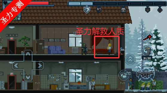 场景探索与战斗操作:游戏采用俯视角,玩家可滑动屏幕调整视角观察房间结构,提前规划进攻路线。角色移动由左侧虚拟摇杆控制,右侧设置射击、跳跃、近战攻击等按钮,支持单发点射、连发射击及武器切换,战斗中需利用环境掩护躲避敌方火力。