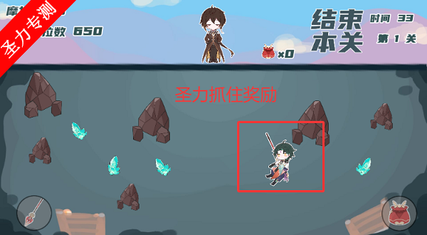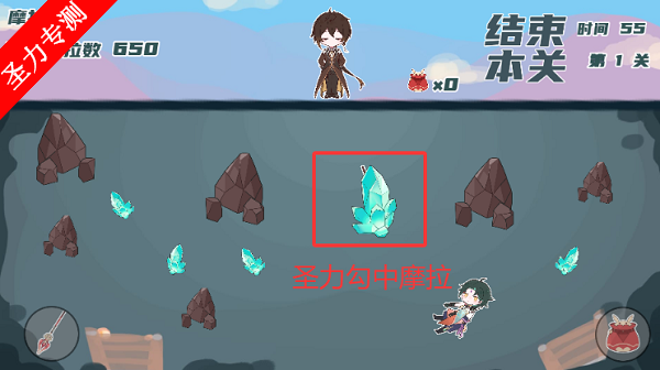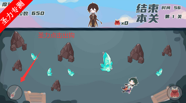 操控角色发射钩爪:玩家操控Q版角色钟离或魈,通过点击滑动屏幕调整角度,发射护摩之杖抓取矿石和宝物,在限定时间内尽可能多地收集高价值目标。