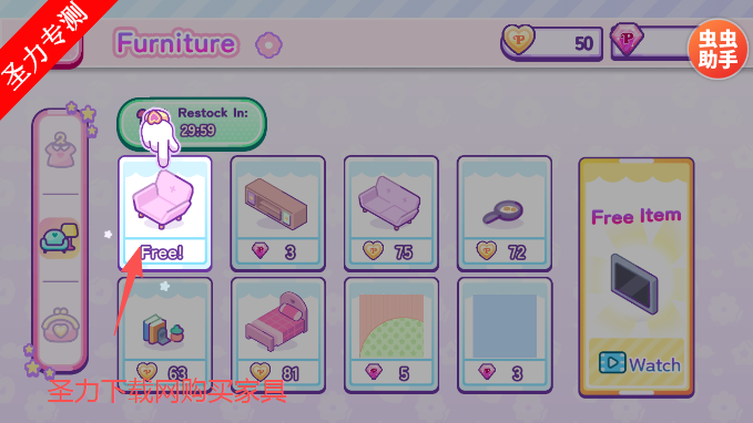 5、跟随教程点击,购买相应家具来装扮布置自己的房子。