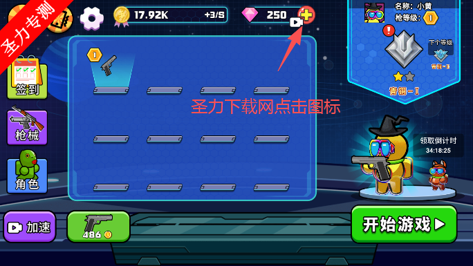 1、在游戏首页点击上方钻石后面的“+”号看广告领取。