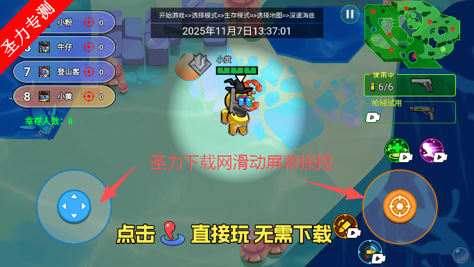 移动控制:采用虚拟摇杆或触屏滑动,控制角色在像素风地图中自由移动,需注意躲避敌人火力。