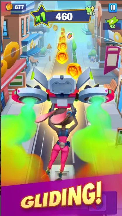 4. 神奇道具助力加分:二段跳跃、护盾、飞行器、双倍金币等道具,为奔跑助力,助你获得更高积分与更好成绩。