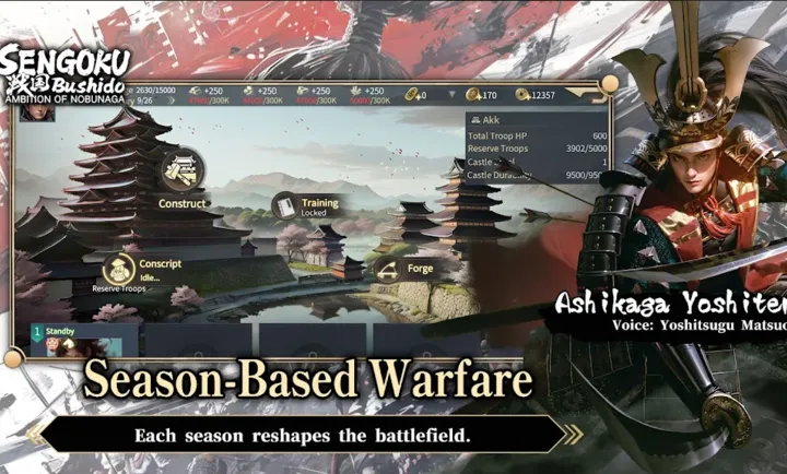 赛季制策略系统,每个新战役带玩家重返战国时代,与联盟并肩作战完成赛季目标,排名依领土控制和目标进度,新赛季领土重置且有全新内容,玩家可重选阵营,从公平战场开始。