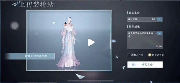 2、点击“上传分享”→上传装扮站→输入作品名称→选择所有人可见或仅自己可见→确认上传即可。