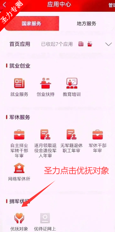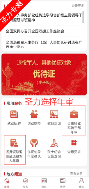 地方频道:各地退役军人部门的服务入口集中展示,同屏区分 “国家服务 / 地方服务”,国家政策权威、地方服务就近办理,异地也能查本地办事指南。