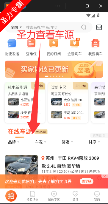 该平台整合个人与商家车源,提供一站式服务:在线查看检测报告、实时竞价、安全支付,并支持代办过户、物流配送。覆盖全国30个省市,合作车商超23万家,每日车源更新频繁,支持跨区域交易,确保车况透明与交易安全,提升二手车流通效率。