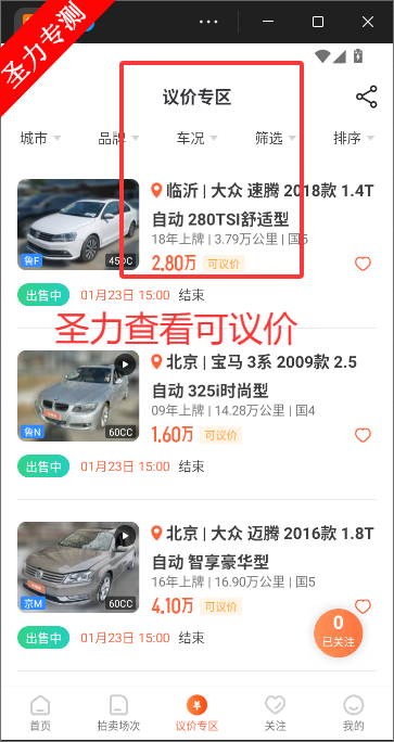 1、议价专区中是可接受谈价的车源