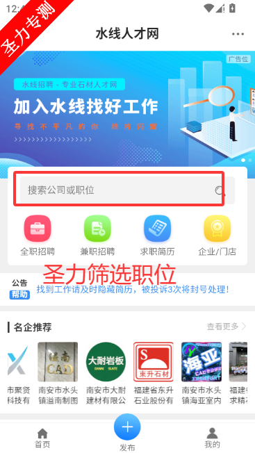 1、在首页点击水线招聘进入招聘专区