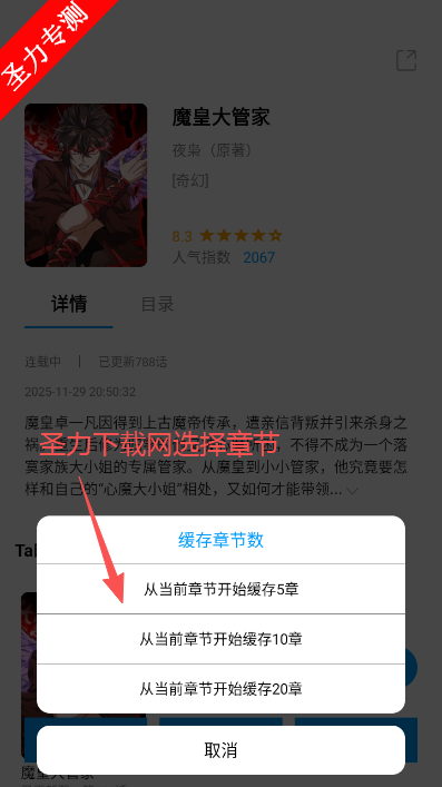 3、在弹出窗口上选择缓存章节即可。