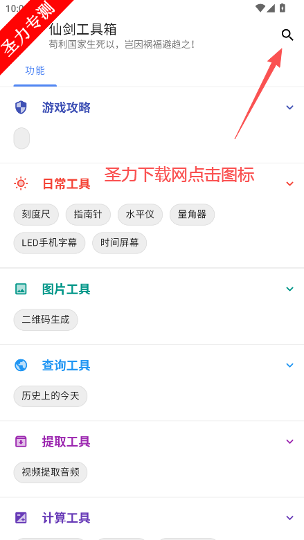3、进入软件首页可以看到各种游戏工具,点击右上角的放大镜图标。
