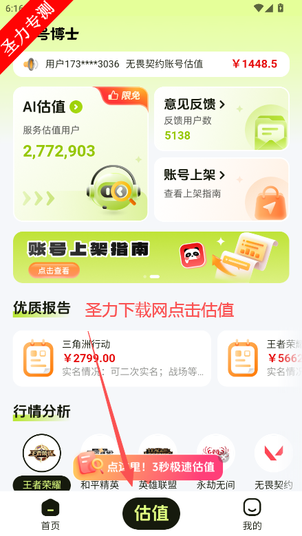 AI智能分析:通过角色等级、装备稀有度、皮肤数量、成就进度等30+维度数据,结合市场交易动态,生成动态估值报告。