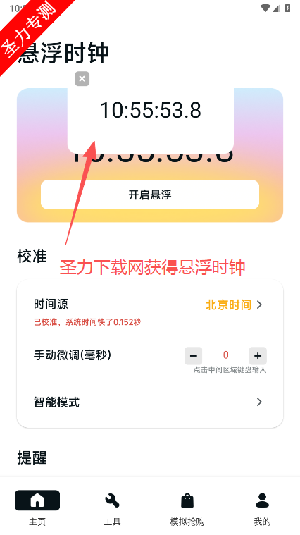 3、进入软件首页可以看到时钟功能,点击开启悬浮按钮。