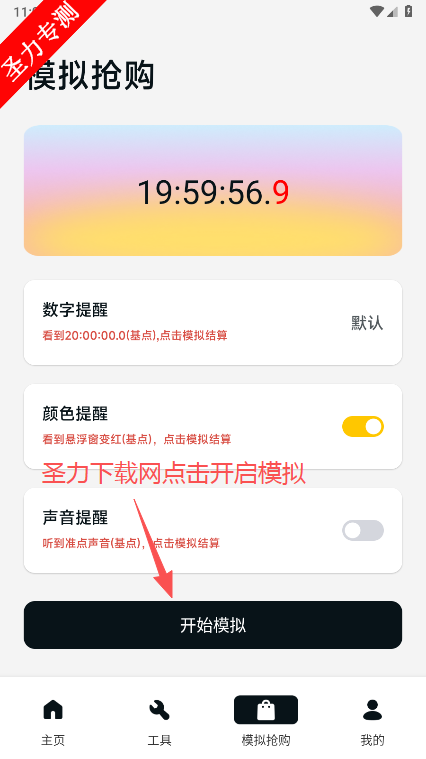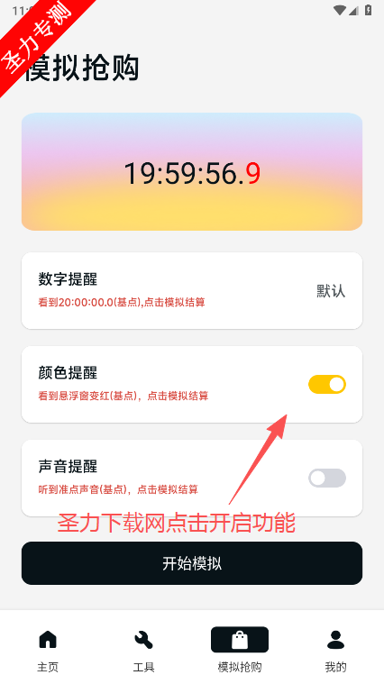 1、在软件首页可以看到下方模拟抢购字样,点击及切换。