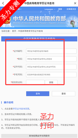 2、例如查询学历证书后即可在查询页面中选择打印按钮进行下载打印