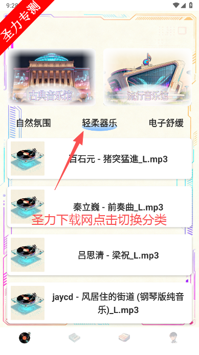 4、点击上方分类字样,还可以切换分类查找合适的音乐。