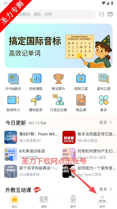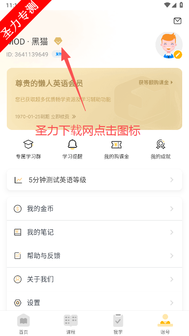 打开软件并进入个人中心:打开懒人英语APP,点击软件下方的【我的】功能按钮,进入个人中心界面。