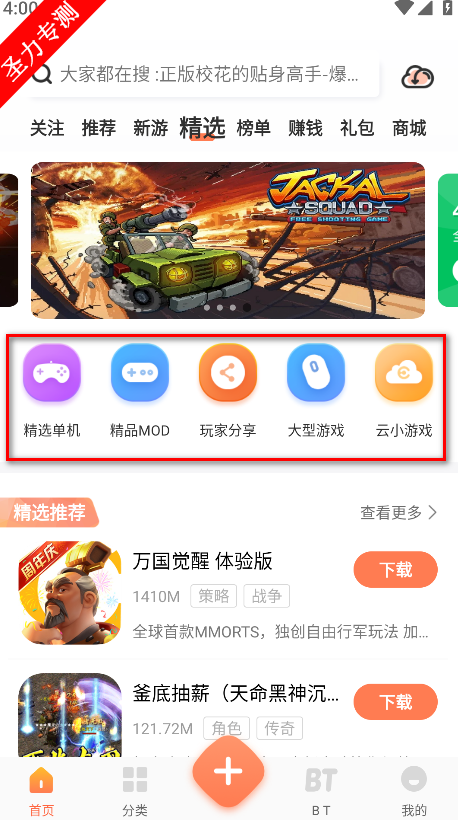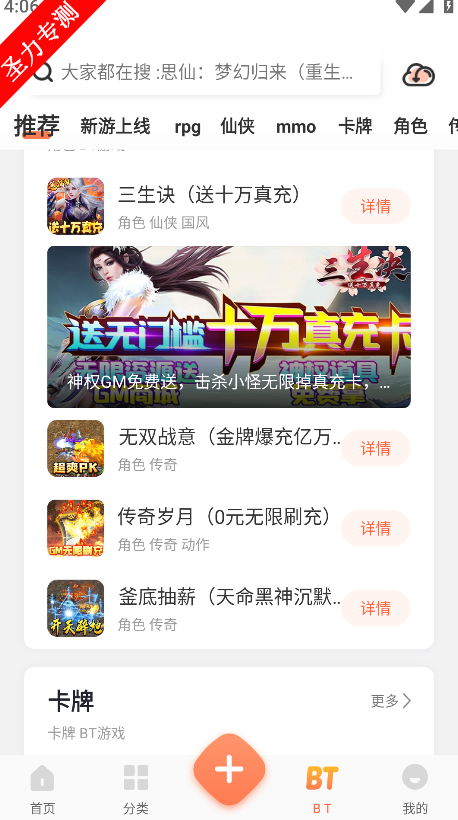 福利丰富:定期发放独家礼包、福利特权、新游激活码等,BT 游戏专区上线就送 VIP,新开服、开测游戏信息一目了然。