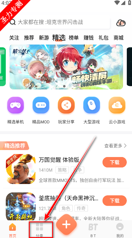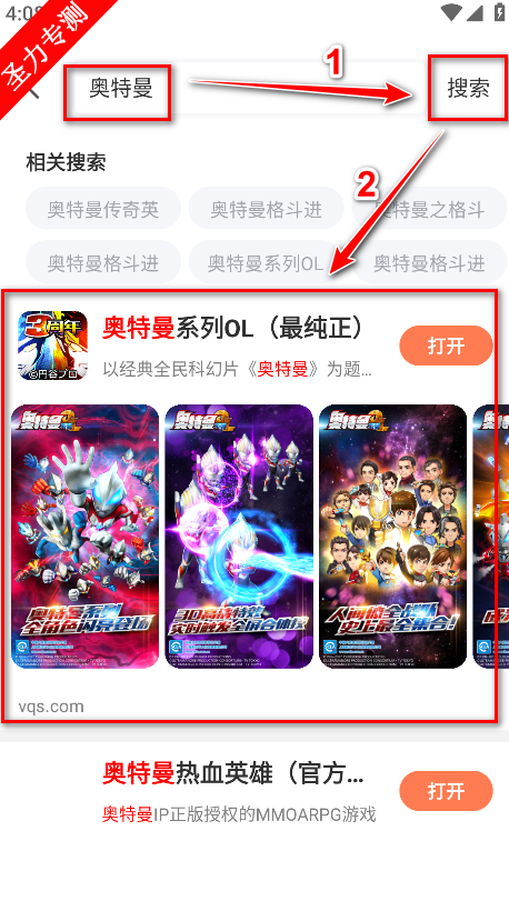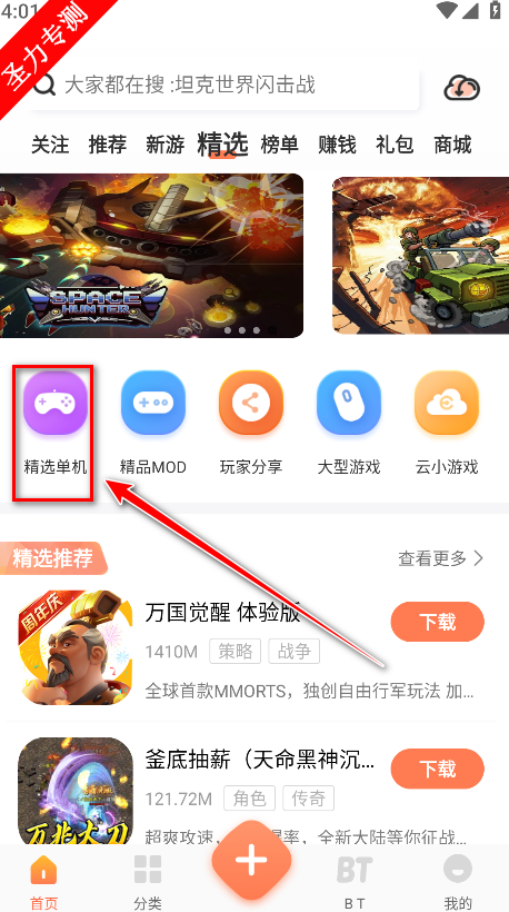 8.点击首页上方的搜索框,直接输入我们想要玩的游戏名称,再点击搜索,接着点击进入我们想要玩的游戏。