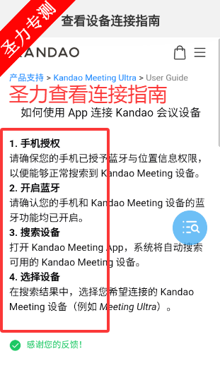 全景会议管理:通过App蓝牙连接Kandao Meeting系列设备(如Ultra/Pro/S),实时操控360°全景摄像头,调整画面视角、屏蔽敏感区域,确保会议室全员入镜,解决传统摄像头视野盲区问题。