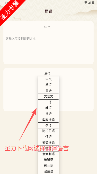 3、在翻译页面可以点击语言下拉窗,选择想要翻译的语言。