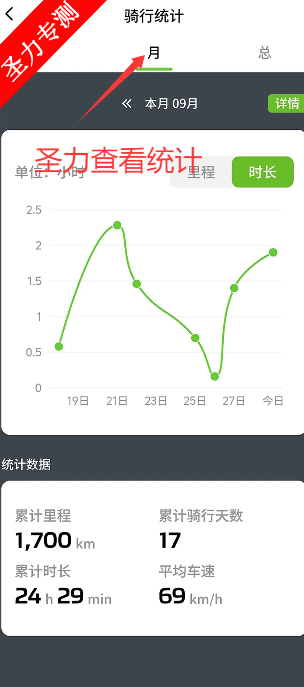 骑行数据深度记录:自动生成每次骑行的轨迹地图、平均速度、最高时速及消耗卡路里等数据,支持按日期筛选与社交平台分享。