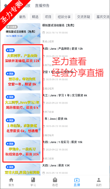 1、在直播页面中可以看到其他用户的经验分享直播,包含学习就业等多方面分享