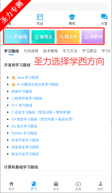 2、在学习页面中可以选择自己的学习方向以及学习内容路线,给自己做出一个合理的规划