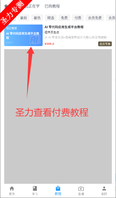 3、在教程页面中可以看到当前正在售卖的付费课程,如果合适可以进行学习