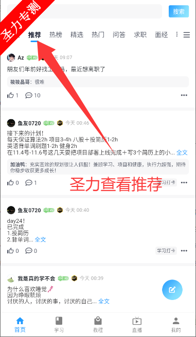 1、在首页的推荐标签下可以看到其他用户分享的自身学习经验以及问题讨论