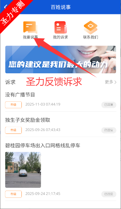 3、百姓说事板块中能够反馈各种不文明的行为以及提出诉求