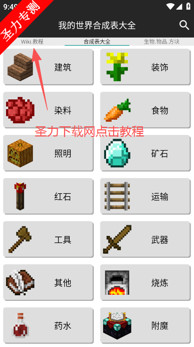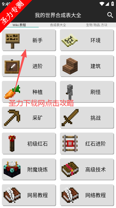 快速上手:通过“基础工具”分类学习工作台、木镐等入门配方,搭配图文教程。