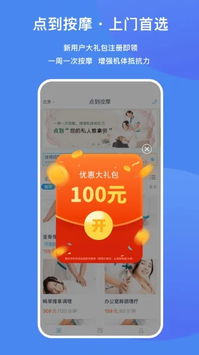 2. 预约便捷超省心:支持APP、公众号、小程序预约上门按摩服务,一键操作,方便快捷,两小时内即可上门。
