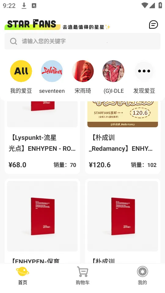 StarFans是售卖明星周边及音乐专辑的购物平台,商品海量且正品优质。有丰富分区便于查找,能查看偶像活动信息互动。提供潮流资讯,售后有保证,购物体验优,还有社交互动功能,方便粉丝交流购物。