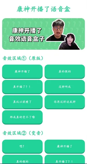 康神开播了语音盒是一款超有趣的搞笑语音工具,能让日常聊天变得超嗨。它收录了大量热门梗音频、经典语录与鬼畜音效,涵盖网络热梗、影视台词、动漫名场面等,点击就能播放,操作特简单。要是遇到“康神开播了语音盒没有声音”的情况,先别急。这软件功能超强大,有热门梗音频收录,能让你紧跟潮流玩新梗;经典语录合集唤起回忆与共鸣;鬼畜音效库适合视频创作。它多场景适用,群聊、私聊、直播、视频创作都能轻松活跃气氛。一键点击播放,还能收藏常用音频方便快速调用。而且完全免费,界面简洁友好,语库持续更新,体积小巧不占空间。即便没声音,也可能是设置问题,比如在首页下滑进入设置区域,看看延迟播放、自动播放等功能是否开启正确,按教程调整下,就能继续享受欢乐啦。