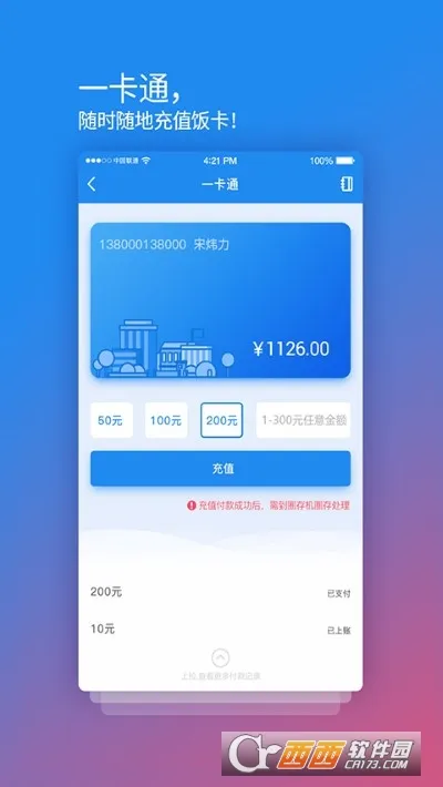 2. 一卡通充值便捷,10秒即可完成,还能在线挂失与查询消费记录。