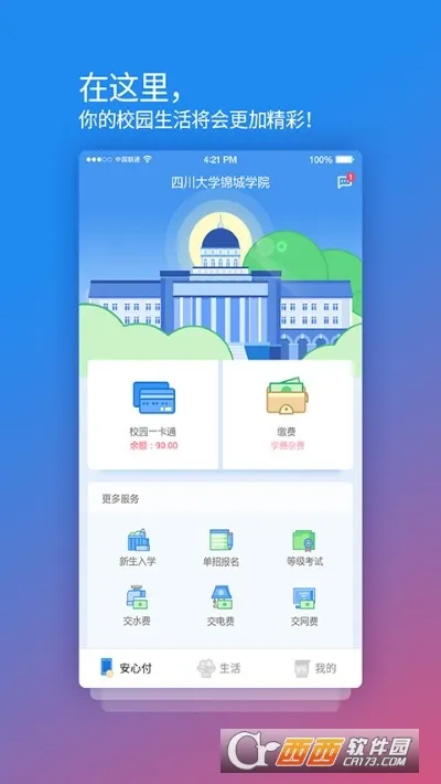校园安心付是成都智汇安新科技有限公司开发的校园服务软件,支持国内200多家银行。能在线挂失充值饭卡、查询消费记录,还可缴纳学费、考试费等,有强大自定义缴费功能,满足校园各种需求。