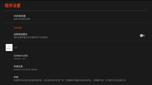CCWebTv升级版本超棒!它是电视与AndroidTV深度定制的开源直播浏览器升级版。内核优化,视频播放流畅清晰、延迟低、闪退少,大大提升电视端直播观看稳定性与连续性。频道列表布局合理,换台效率高。在经典项目基础上全面升级,稳定性、兼容性与播放体验大幅提升。还搭载腾讯X5浏览器内核,网页渲染快、视频解码强。1.8.3版本增加了点播功能,能看电影、剧集、综艺、短剧,从单纯直播工具升级为综合性视频娱乐平台。节目内容扩充到165个频道,还有轮播节目、电台音乐节目。纯音频有可视化特效,睡眠定时功能贴心。它对各类电视盒子、智能电视适配完善,低版本Android系统也能稳定运行,在老旧设备上运行更稳定,能很好地满足大家的视听需求。