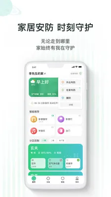 基于环境光线、温度、空气质量、安防传感器,并结合日出日落,自动变换分区背景,一眼即可把握全屋状态,轻松知晓家中情况。