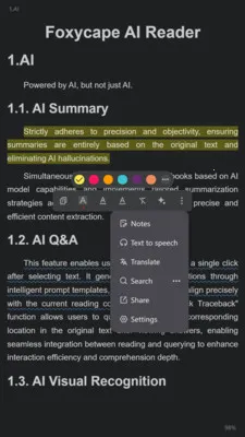 功能丰富,体验极致:具备一键问AI、一键溯源、AI视觉识别、自定义AI服务商、多种版式、智能书架与文件管理、多格式支持、代码高亮、音视频支持、思维导图、搜索与翻译、语音朗读等众多功能,还有诸多贴心细节。
