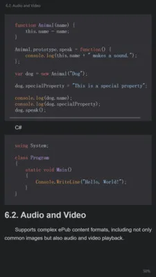 3、多格式支持:兼容ePub、PDF等主流格式,代码高亮,音视频支持,思维导图实用,搜索与翻译强大,语音朗读方便。