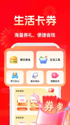 海量生活卡券,餐饮美食、生活工具、学习办公、视频会员等场景券一键领取,立省开支。