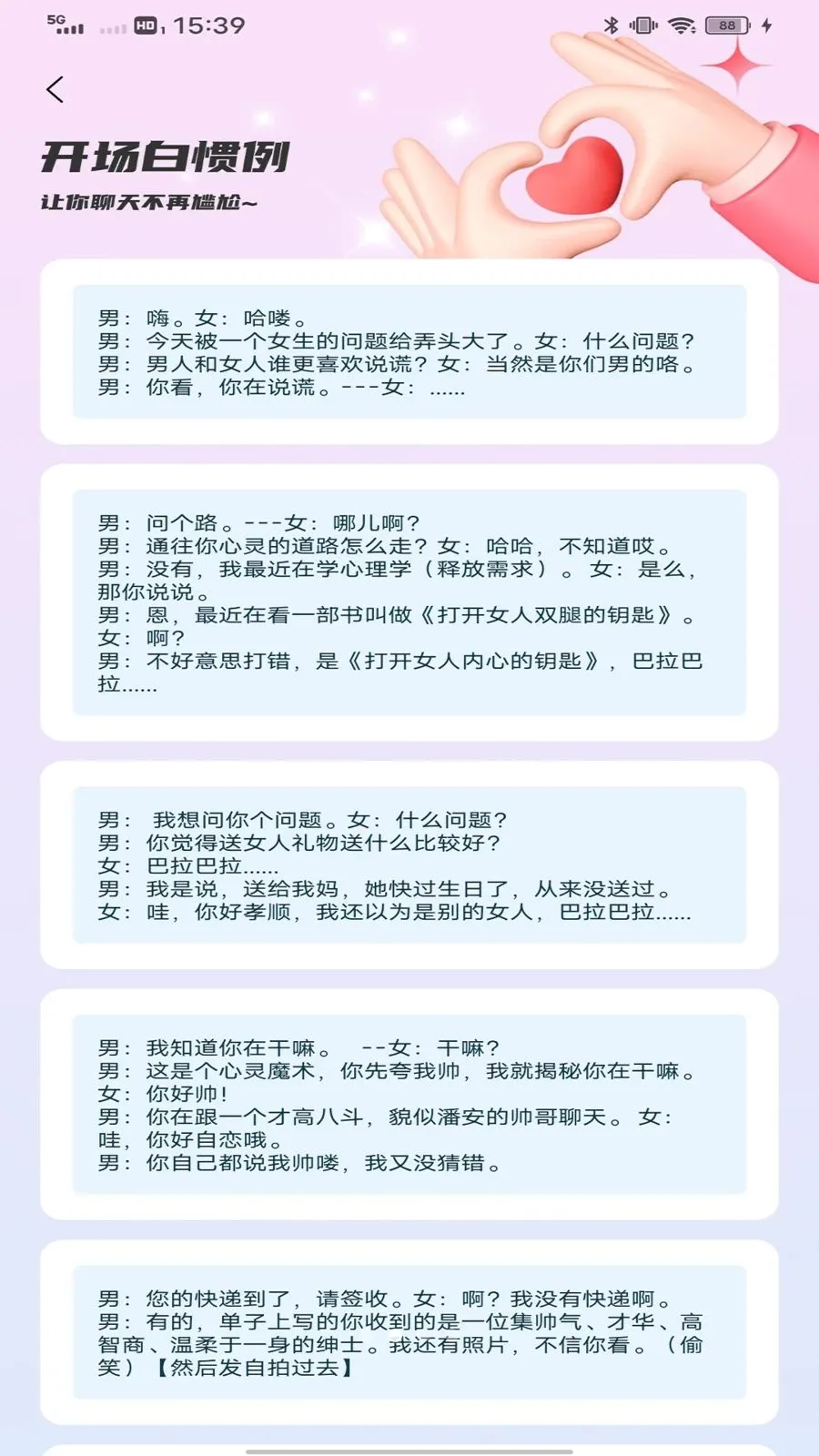 拥有丰富精选话术,涵盖搭讪、交友、聊天、互动等多种类型,能有效助力社交。