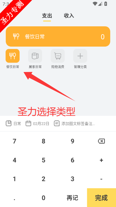 1、选择支出或收入和类型,输入数额即可添加